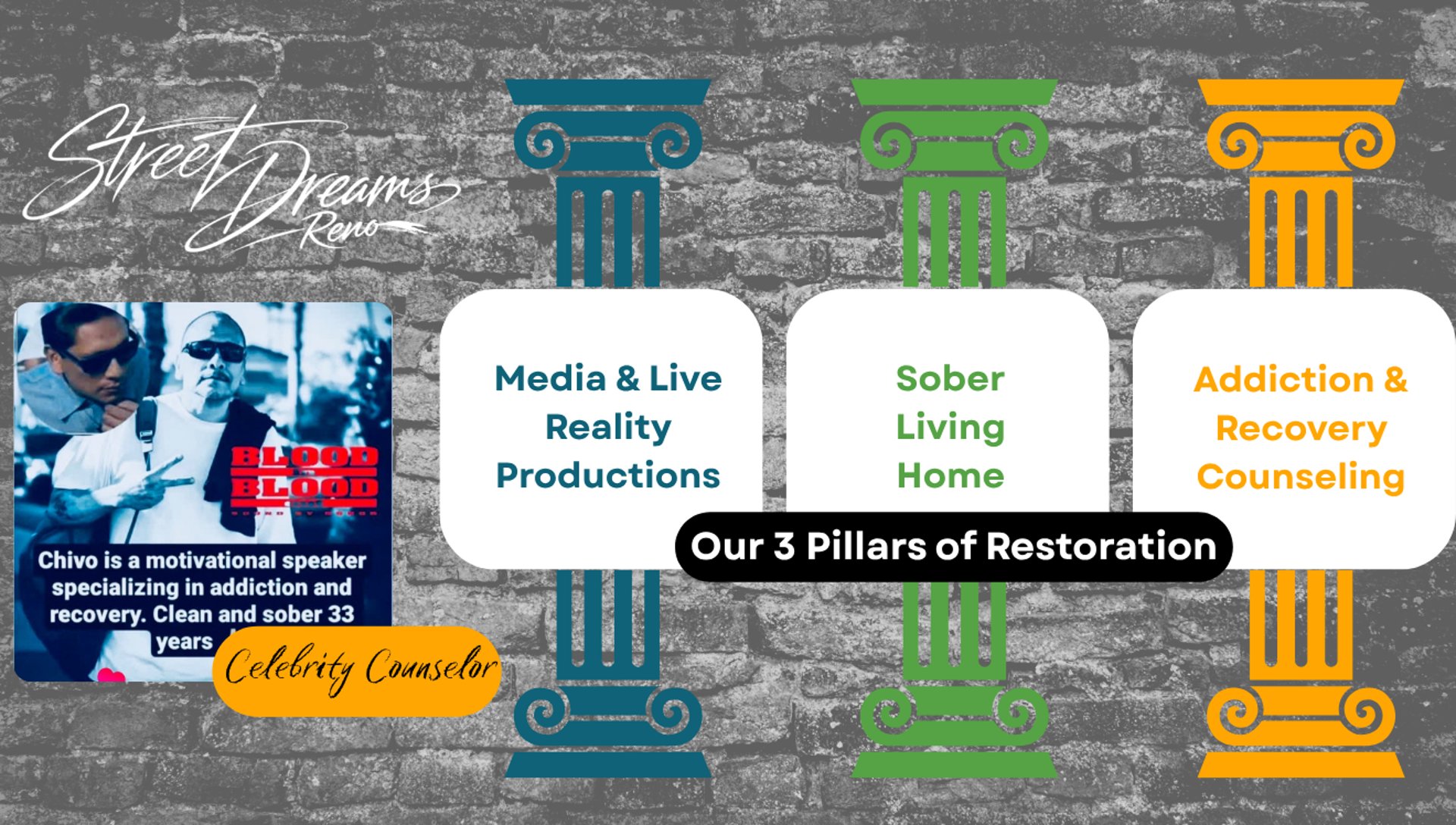 Through our three pillars—Media & Live Reality Productions, Sober Living Homes, and Addiction & Recovery Counseling—we walk alongside individuals in their lowest moments and capture the journey of renewal. Guided by faith, compassion, and authenticity, we serve as bridge-builders between brokenness and restoration, turning real experiences into living testimonies that reveal Christ as the true source of hope.